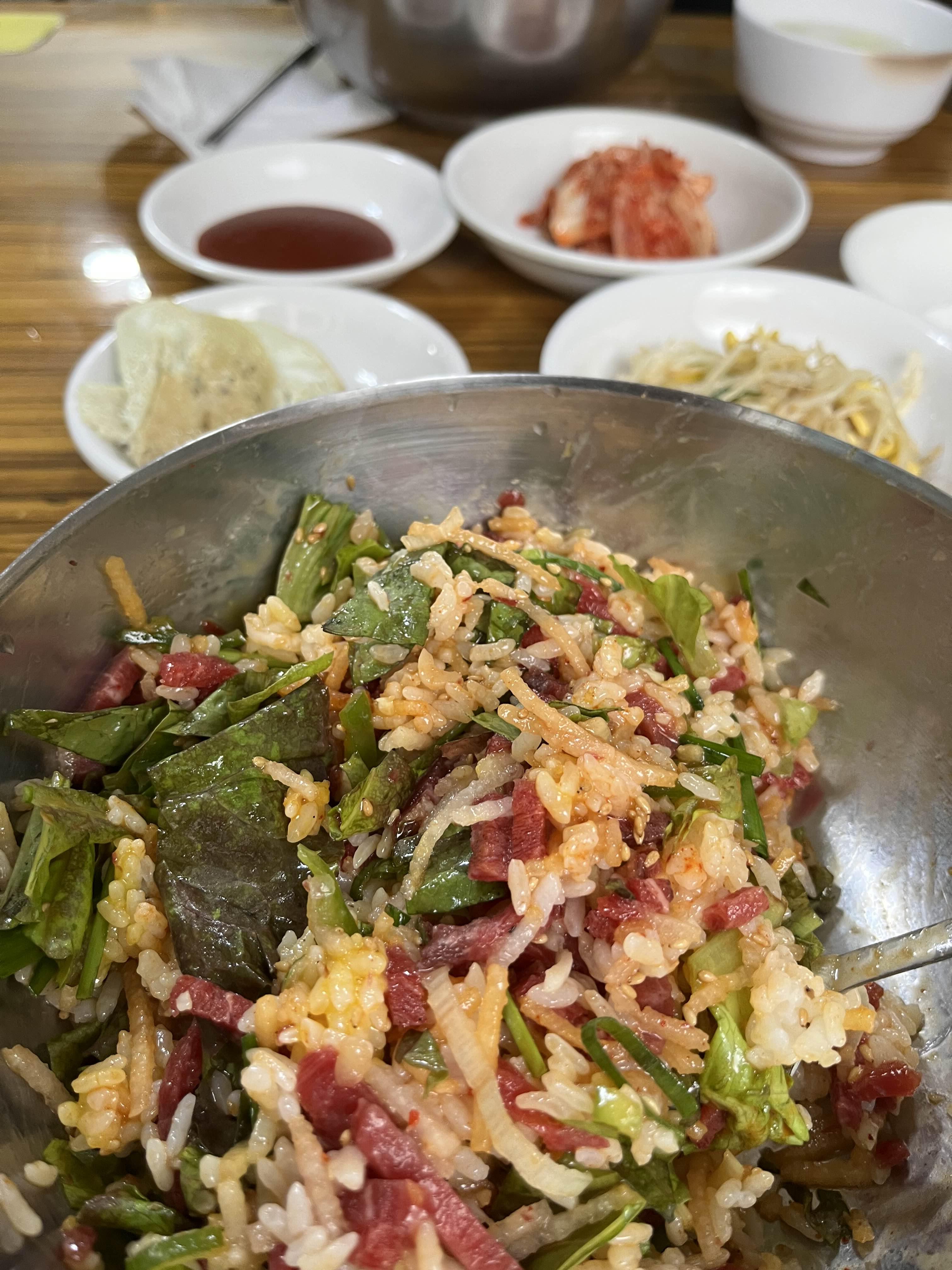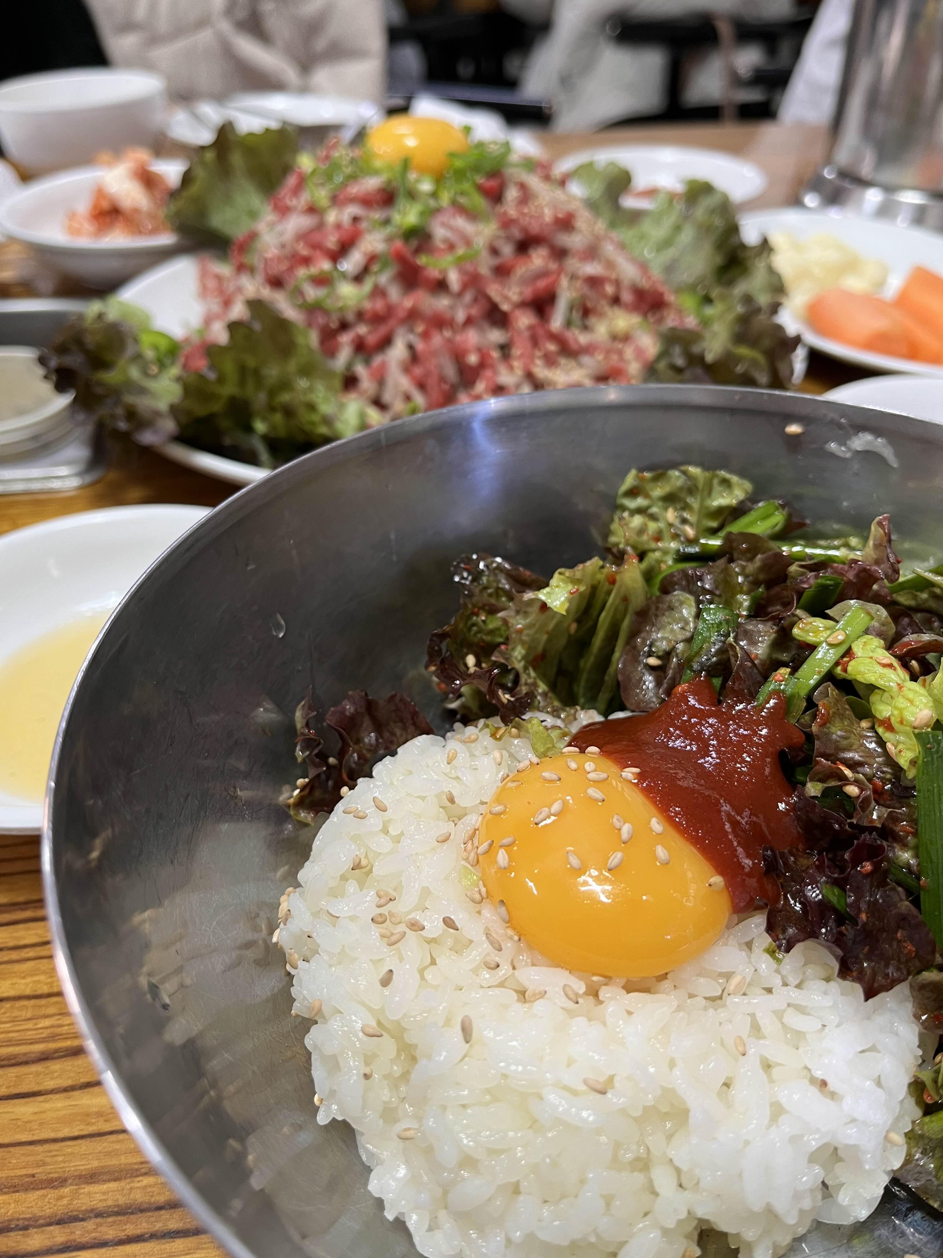 육회 한 접시, 그리고 양념밥을 인원 수대로 시키는 것.
